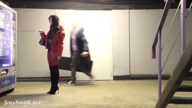 Jeny Smith public walking in red seamless pantyhose